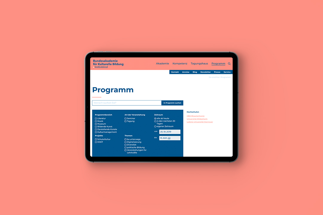 In 2017, we helped the academy flesh out basic ideas for a digital strategy. The main results were: more focus on users and networks and less on print materials, as well as relief for overworked staff. Next, we did a complete overhaul of the website to make it the focal point of communication. Now live and online, the new website offers clearly structured content, showcases the academy’s areas of expertise and features a shop (linked to the academy’s administrative software) where users can book seminars directly. Implementation in TYPO3, including the development interface, was handled by Die NetzWerkstatt.