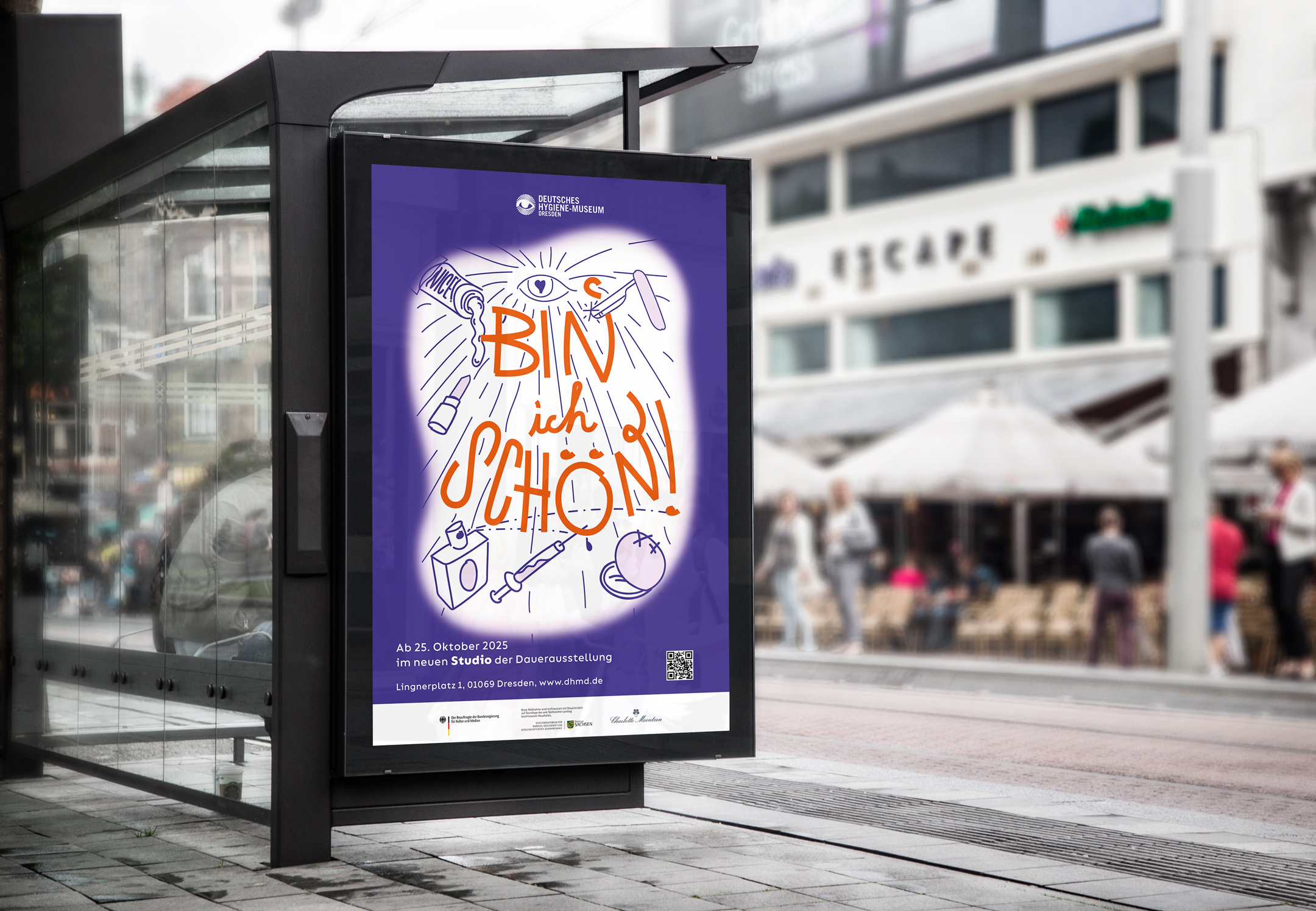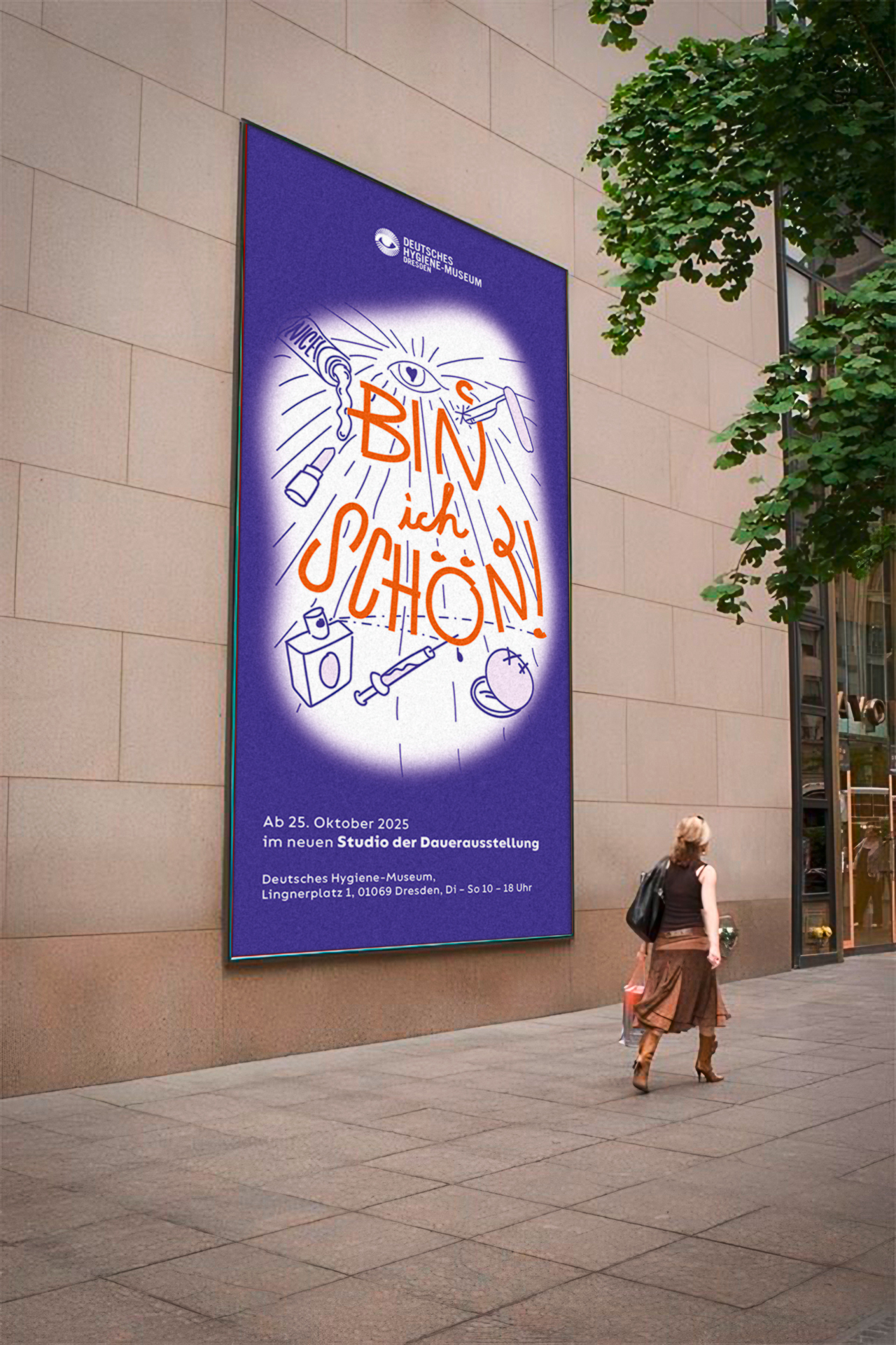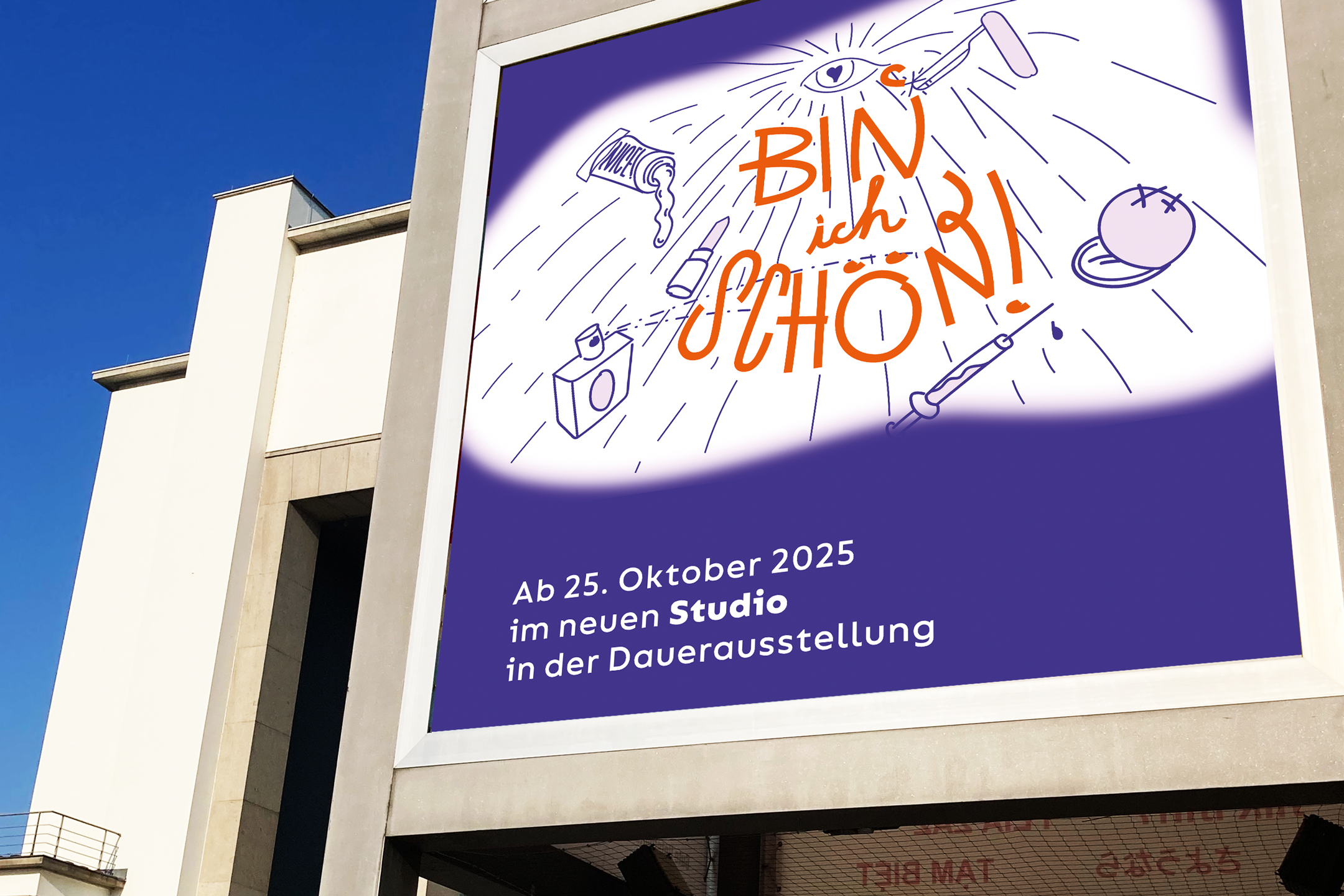 The visual concept translates the personal question of Beauty into an open, dialogical visual language. Concise typography and playful illustration of our supposed everyday beauty aids emphasize the inviting nature of the exhibition. This allows the exhibition to address visitors directly on both a rational level – as a reflection on societal ideals of beauty – and on an emotional level. “Bin ich schön!” will be on display in the studio for two years and will then be replaced by the results of future collection projects.