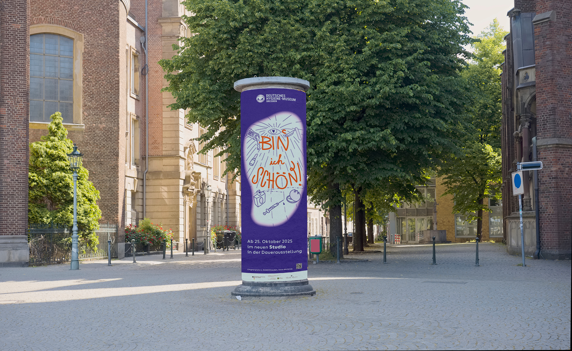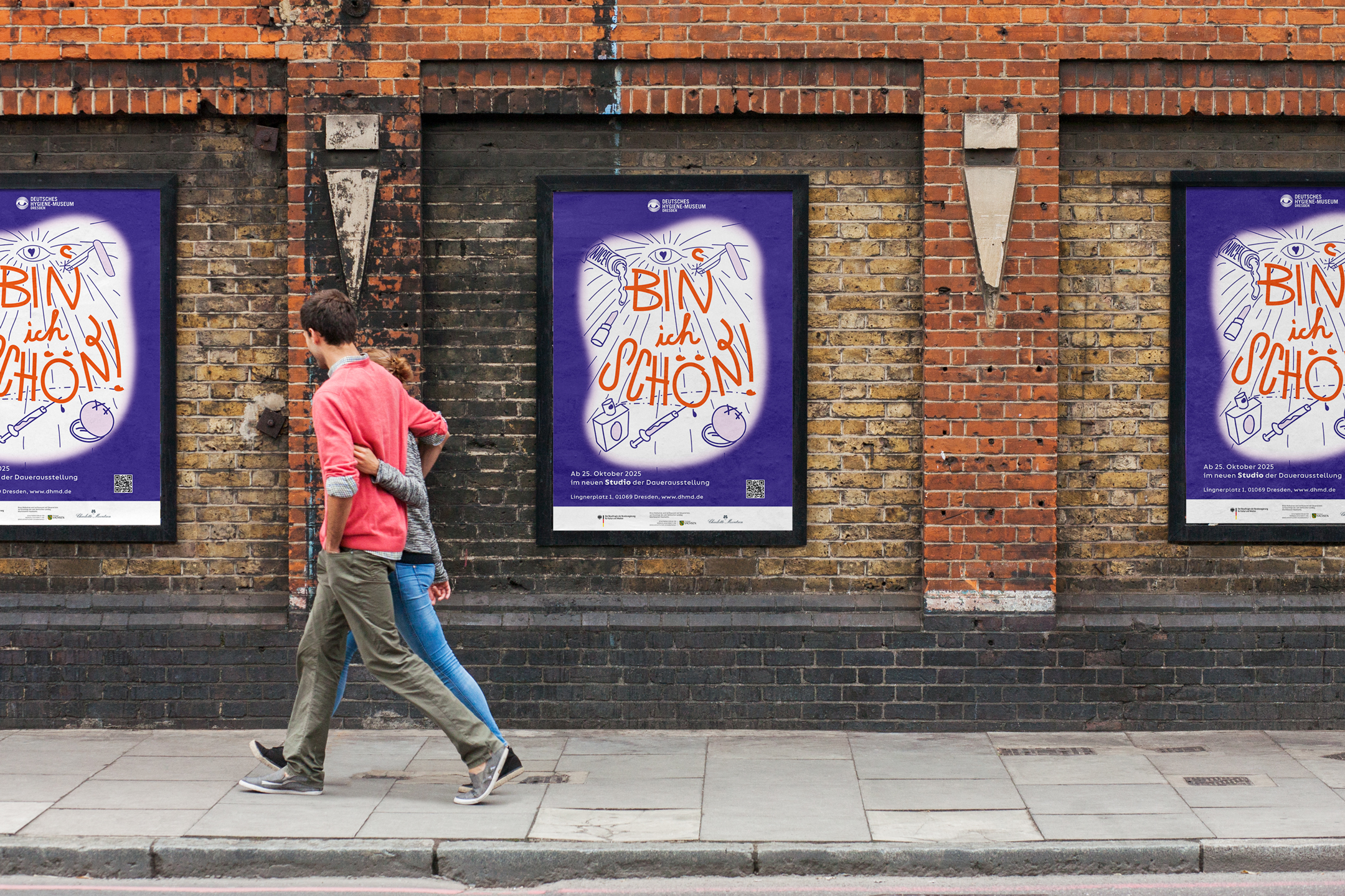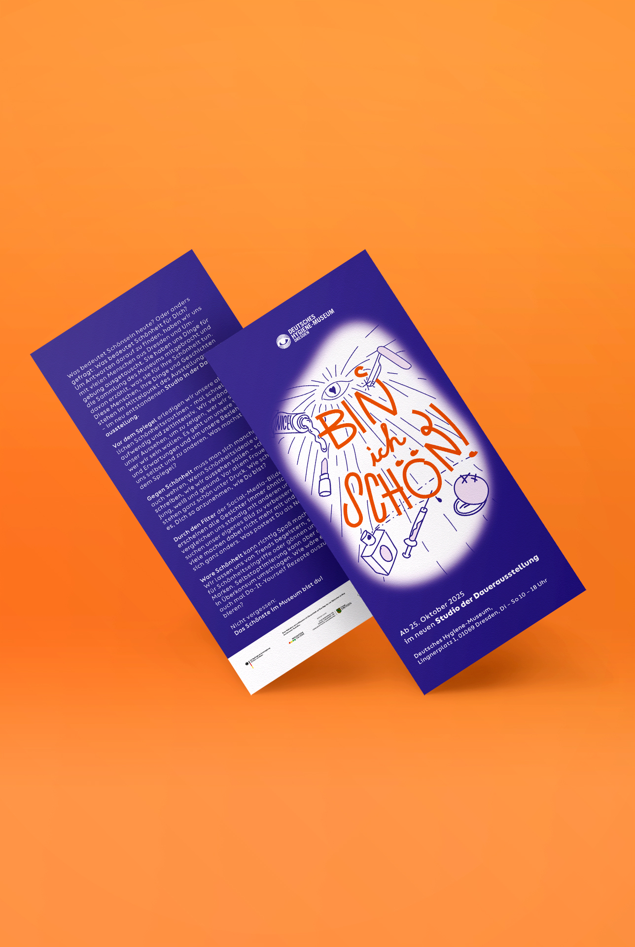 The visual concept translates the personal question of Beauty into an open, dialogical visual language. Concise typography and playful illustration of our supposed everyday beauty aids emphasize the inviting nature of the exhibition. This allows the exhibition to address visitors directly on both a rational level – as a reflection on societal ideals of beauty – and on an emotional level. “Bin ich schön!” will be on display in the studio for two years and will then be replaced by the results of future collection projects.